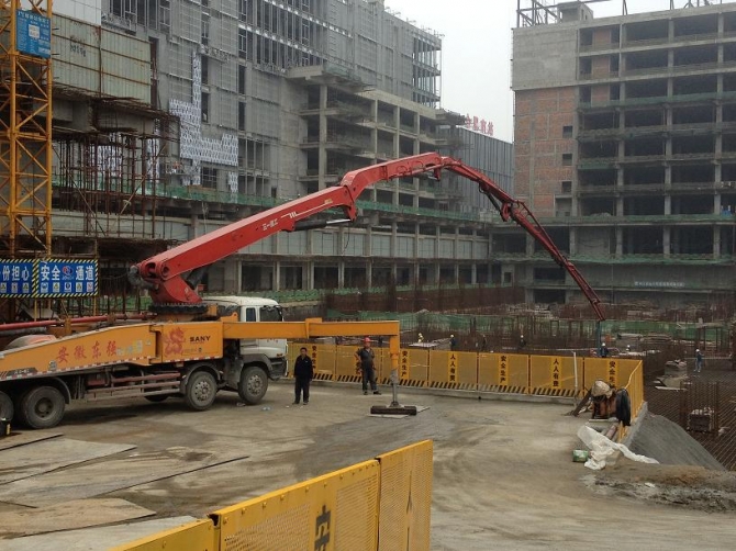 合肥綠地中央廣場位于高鐵路與廬州大道交口,高鐵南站旁。該項(xiàng)目由合肥建工集團(tuán)承建,其中塔樓D建筑高度為200m,底板砼強(qiáng)度為C45P8,12000立方砼一次性連續(xù)澆筑,我公司48小時(shí)完成該項(xiàng)目12000方砼連續(xù)澆筑。該部位砼難點(diǎn)在于水化熱的控制,因?yàn)樵O(shè)計(jì)強(qiáng)度高(C45),底板核心筒位置厚度達(dá)9m。經(jīng)過我公司技術(shù)團(tuán)隊(duì)的精心設(shè)計(jì),優(yōu)化配合比,采用優(yōu)質(zhì)粉煤灰.礦渣粉雙摻,降低水泥用量等技術(shù)措施,該項(xiàng)目底板沒有出現(xiàn)裂縫。經(jīng)過長達(dá)15天的溫度監(jiān)測,砼中心溫升未超過60攝氏度,溫差未超過25攝氏度,該部位施工完美結(jié)束。